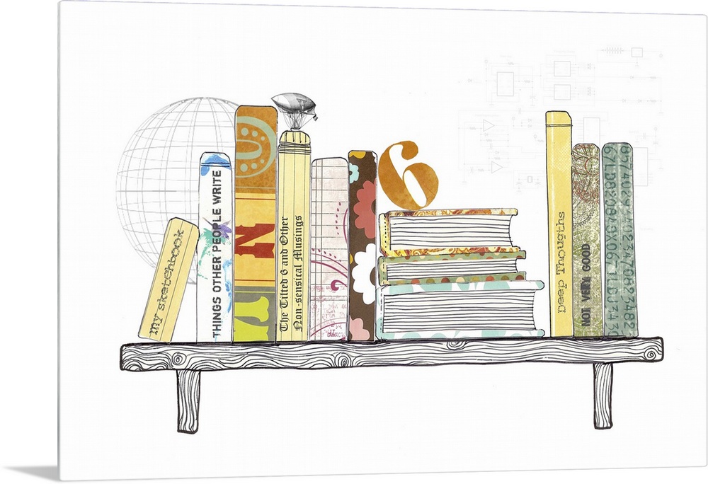 <p>A mixed media poster and art print of an interpretation of a stack of books on a shelf. Illustration, collage and brushes all work together.</p>