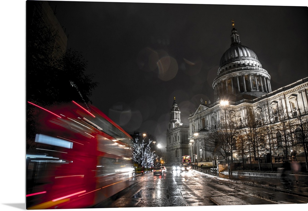 <p>A London bus drives past St. Paul's Cathedral towards Christmas lights, London, England, United Kingdom, Europe</p>