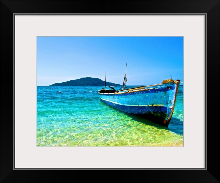 <p>A lone boat on the shore of Cayos Cochinos, Honduras.</p>