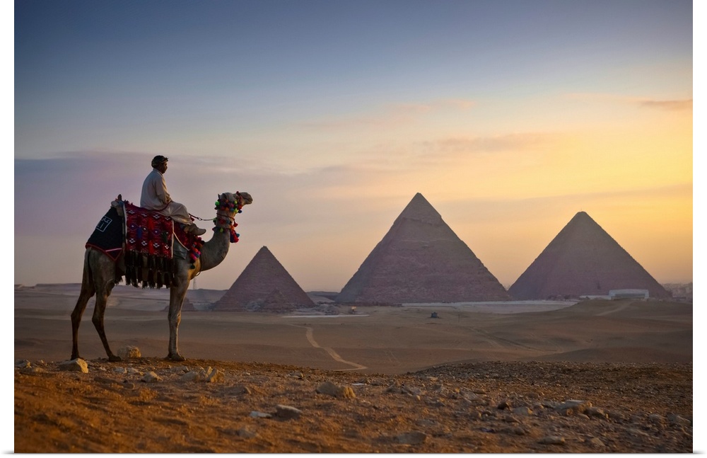 <p>A lone camel and rider stand in front of the setting sun with the great pyramids behind them; Giza, Egypt</p>