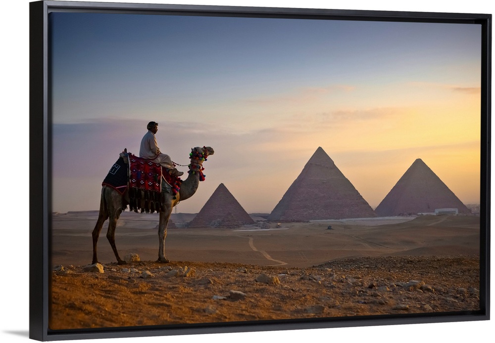 <p>A lone camel and rider stand in front of the setting sun with the great pyramids behind them; Giza, Egypt</p>
