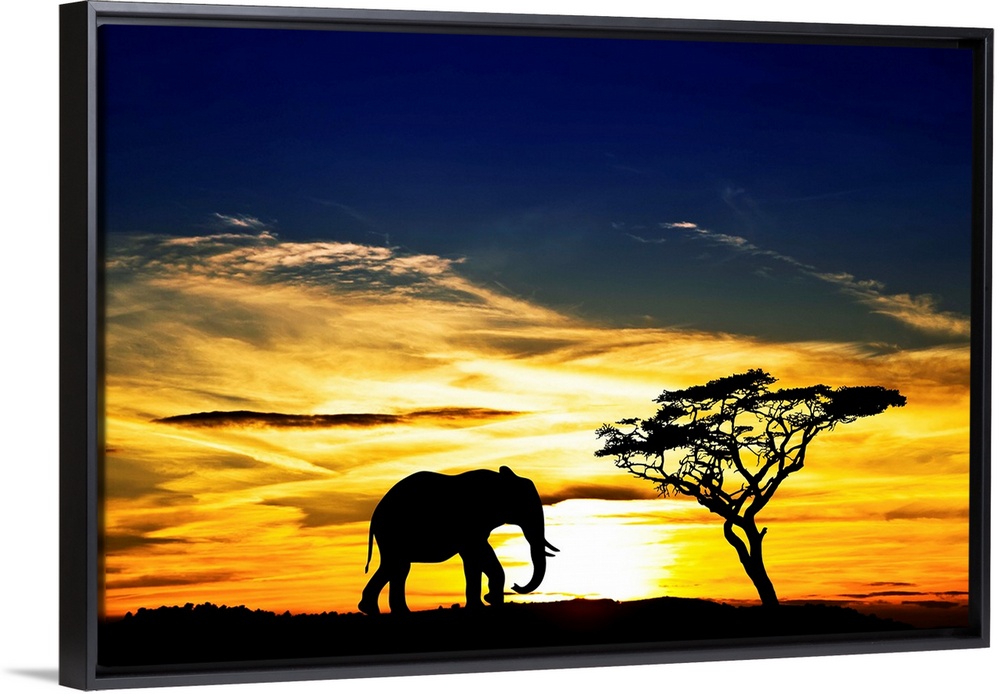 <p>Setting sun casts a silhouette from a lone elephant and tree in Africa.</p>
