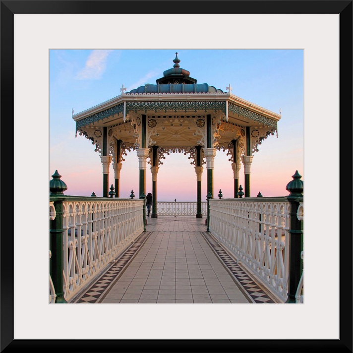 <p>A lone figure and an almost symmetrical shot of an ornate seaside bandstand. The sky is awash with beautiful pastel colours as sunset approaches.</p>