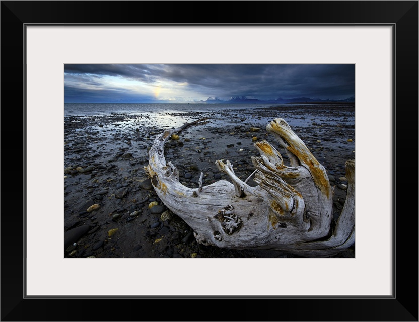 <p>A lone piece of drift wood rests on the beach with a faint rainbow in the distance; Homer, Alaska</p>