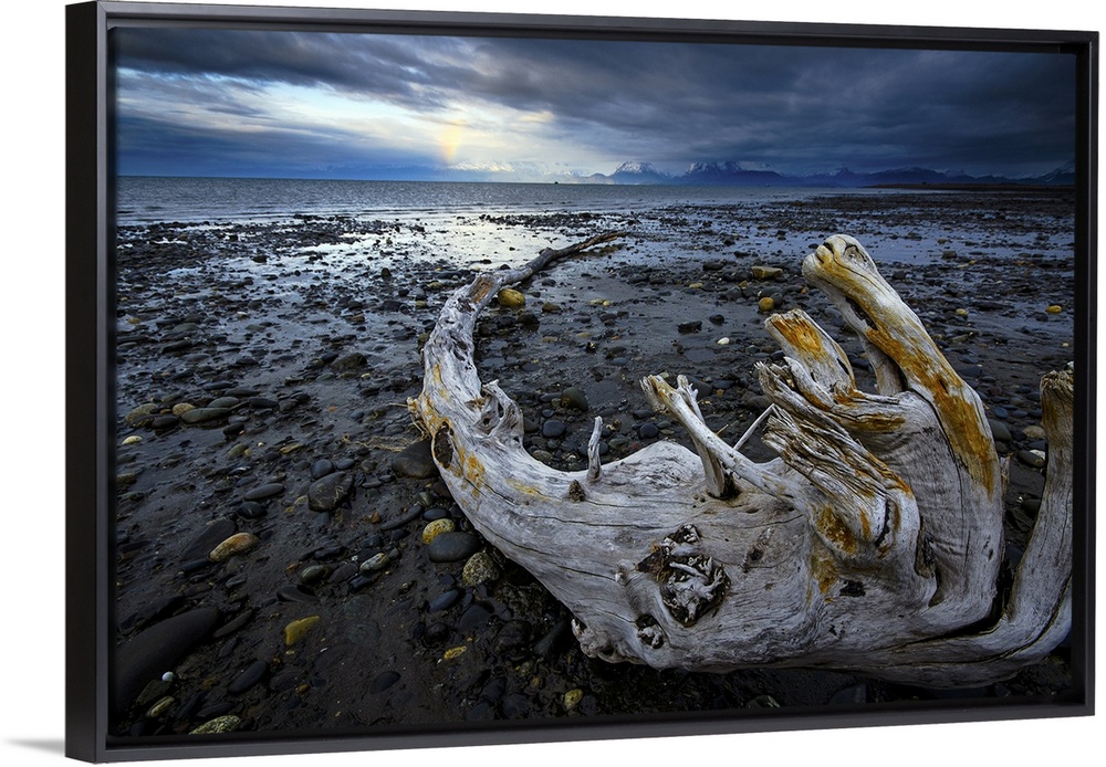 <p>A lone piece of drift wood rests on the beach with a faint rainbow in the distance; Homer, Alaska</p>