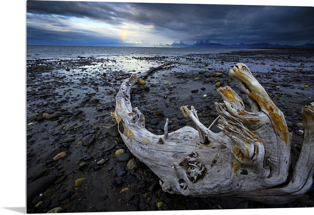 <p>A lone piece of drift wood rests on the beach with a faint rainbow in the distance; Homer, Alaska</p>