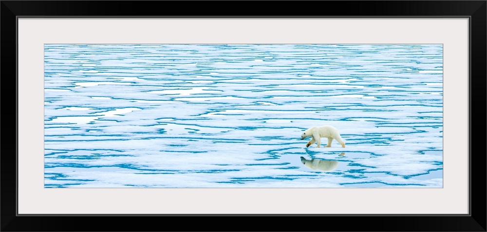 <p>A lone polar bear walks along ice on the Arctic Ocean.</p>