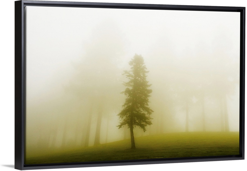<p>A lone tree separated from other trees by a curtain of mist</p>