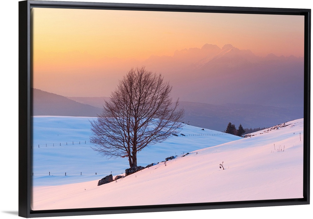 <p>A Lonely Beech On Snowy Pastures Of Mezzomiglio With Schiara Group On Background, Prealps Of Belluno, Farra d'Alpago, Belluno Province, Veneto, Italy</p>