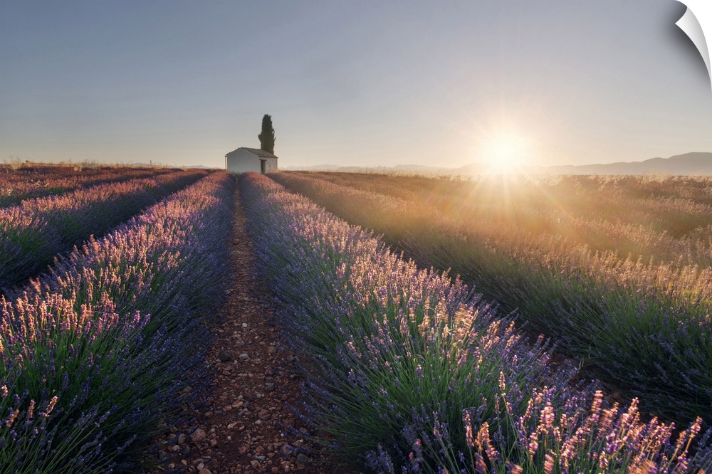 <p>A lonely farmhouse in the middle of lavender's fields at sunrise, Provence, France</p>