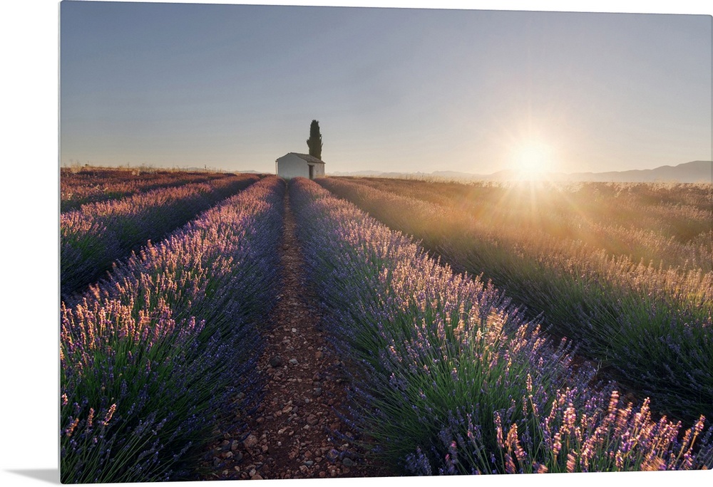 <p>A lonely farmhouse in the middle of lavender's fields at sunrise, Provence, France</p>