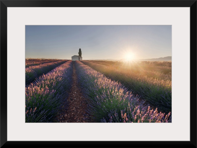 <p>A lonely farmhouse in the middle of lavender's fields at sunrise, Provence, France</p>