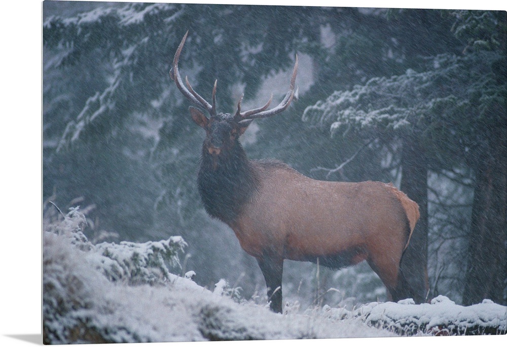 <p>A mighty, proud bull elk stands alone and braves the snowfall in the Vermilion Lakes area of the Banff National Park in Alberta, Canada in this large National Geographic photo. Light snowfall covers the ground, elk, and tress in the forest background.</p>
