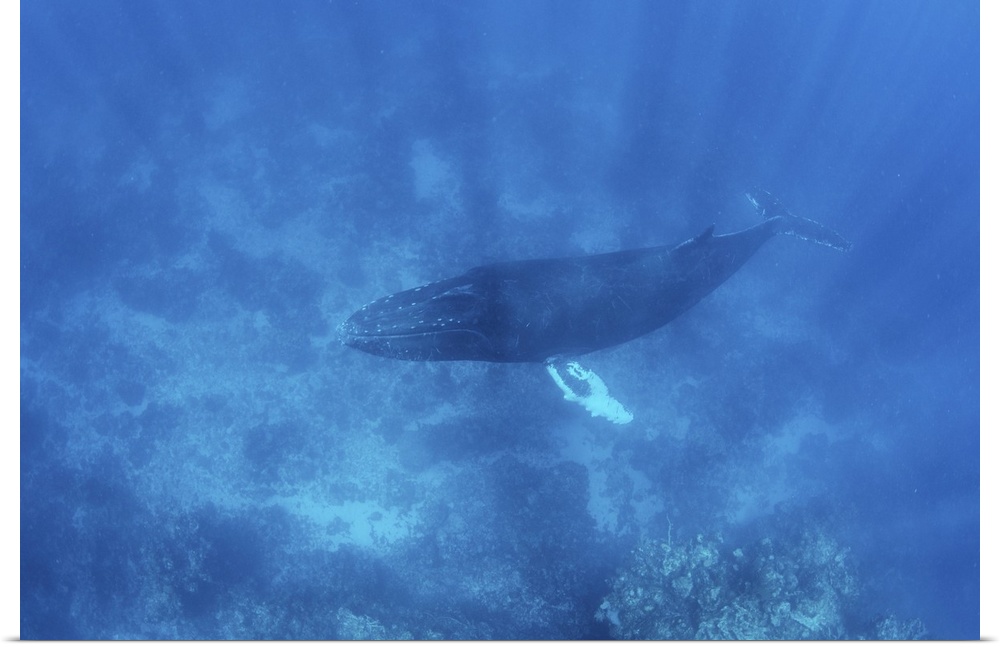 <p>A magnificent humpback whale swims in the blue waters of the Caribbean Sea.</p>