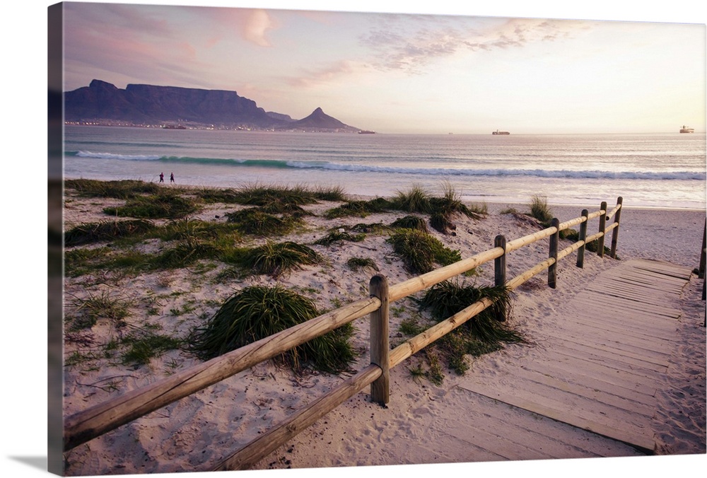 <p>A magnificent view of a sunset unfolds over a wooden boardwalk that leads onto a sandy beach overlooking Table Mountain with a beautiful sun setting over Table Bay, Tableview, Cape Town, Western Cape Province, South Africa.</p>