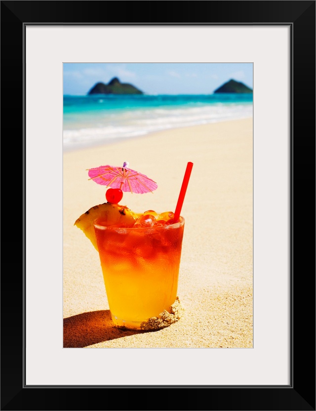 <p>A mai tai garnished with pinapple and a cherry, sitting in the sand on the beach.</p>