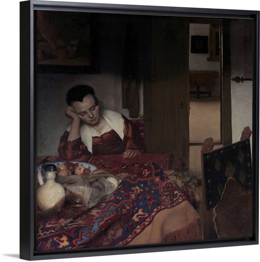 <p>This picture is probably the earliest in which the Delft painter treats his favorite theme of a young woman, occasionally with a male companion, in a domestic interior. An overdressed maid has dozed off after entertaining a visitor (two glasses, a pitcher, and a jug may be seen in the jumbled still life). The painting above her depicts Cupid unmasked, an oblique explanation of her dreamy smile. Radiographs show that Vermeer originally painted a man in the background and a dog to the lower right. By replacing these motifs he made the amorous theme less obvious, quite as his remarkable passages of observation obscure his debts to contemporary painters like Nicolaes Maes.</p>