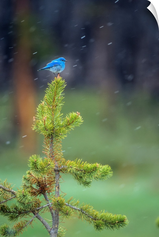 <p>A male Mountain bluebird (Sialia currucoides) perched on the top of a small lodgepole pine (Pinus contorta), watching for insects, Yellowstone National Park, Wyoming, United States of America. Mountain bluebirds are one of Yellowstone's first returning migrant birds. They start to appear in March. Their bright blue plumage stands out in sharp contrast to the snow and dull brown vegetation that prevails in early spring. This male perched on the top of a small lodgepole pine, watching for insects in the early grasses. It was snowing lightly and the cold damp breeze caused both of us to fluff up and try to stay warm.</p>