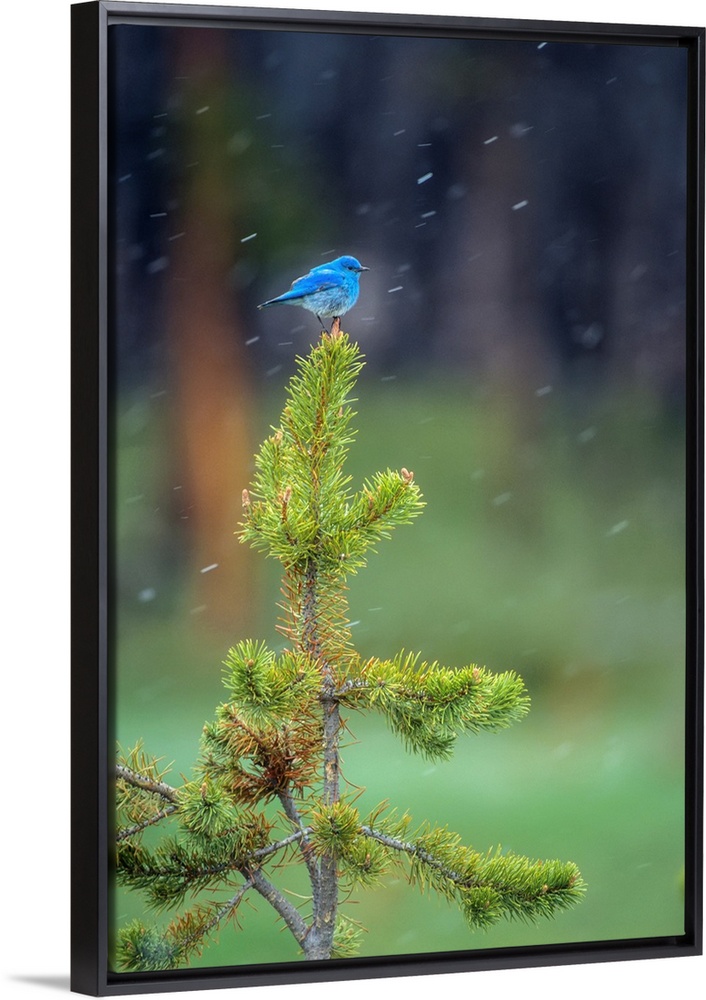 <p>A male Mountain bluebird (Sialia currucoides) perched on the top of a small lodgepole pine (Pinus contorta), watching for insects, Yellowstone National Park, Wyoming, United States of America. Mountain bluebirds are one of Yellowstone's first returning migrant birds. They start to appear in March. Their bright blue plumage stands out in sharp contrast to the snow and dull brown vegetation that prevails in early spring. This male perched on the top of a small lodgepole pine, watching for insects in the early grasses. It was snowing lightly and the cold damp breeze caused both of us to fluff up and try to stay warm.</p>