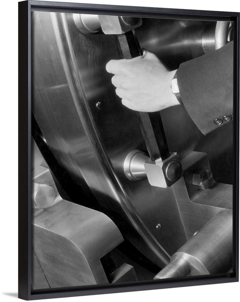 <p>A disembodied hand grasp the handle of a large bank vault and pushes it closed. Undated photograph.</p>