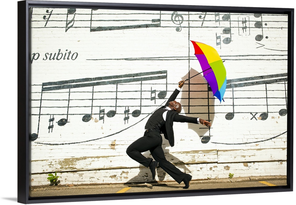 <p>A young man jumping and dancing with an umbrella outside in front of a wall with musical notes on it.</p>