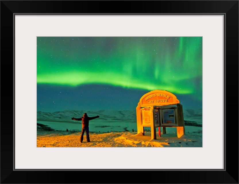 <p>A man looks in awe at the northern lights near the Arctic Circle sign.</p>