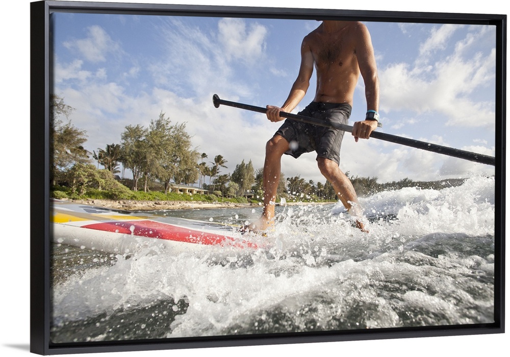 <p>Low angle view of a young man riding an ocean wave on a stand up paddle board</p>