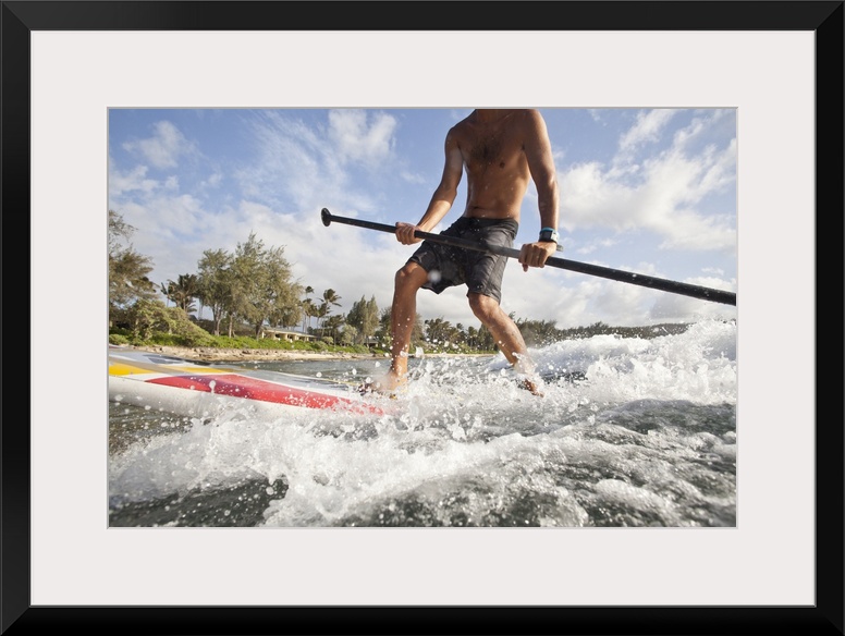 <p>Low angle view of a young man riding an ocean wave on a stand up paddle board</p>