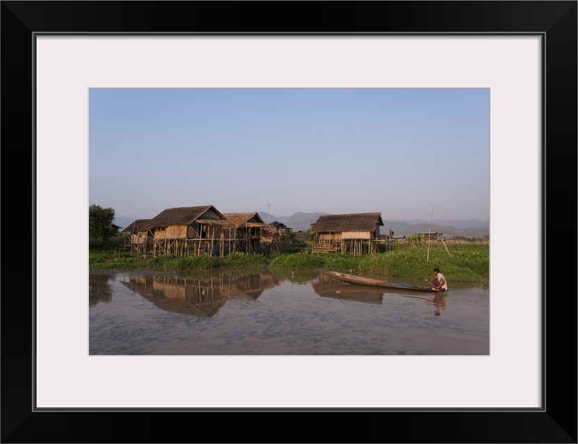 <p>A man paddles his canoe past one of the floating villages on Inle Lake, Myanmar</p>
