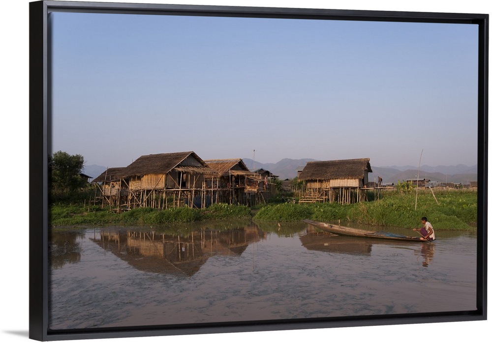 <p>A man paddles his canoe past one of the floating villages on Inle Lake, Myanmar</p>