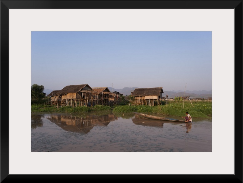 <p>A man paddles his canoe past one of the floating villages on Inle Lake, Myanmar</p>