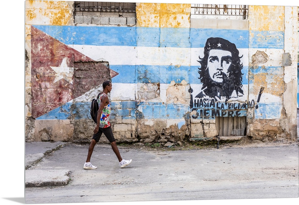 <p>A man walking in a front of Che Guevara street art in La Habana Vieja (Old Town), Havana, Cuba</p>