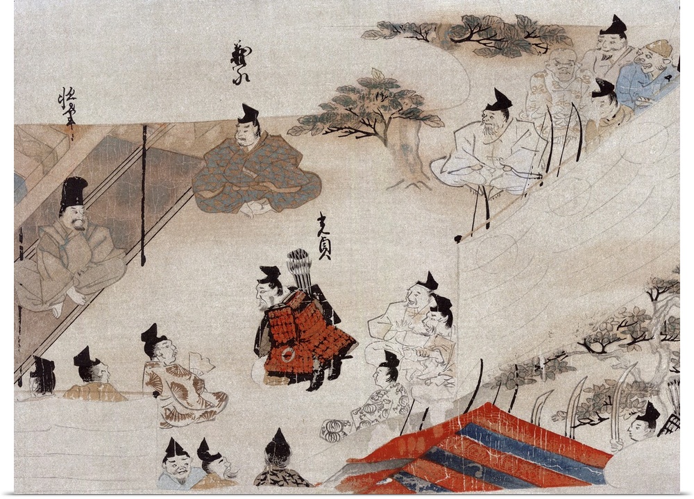 <p>Colour print shows a man wearing padded armour with a quiver full of arrows kneeling before a man sitting on a raised platform with members of his court sitting at the periphery of the mostly enclosed area; soldiers with bows and swords wait outside the en.</p>