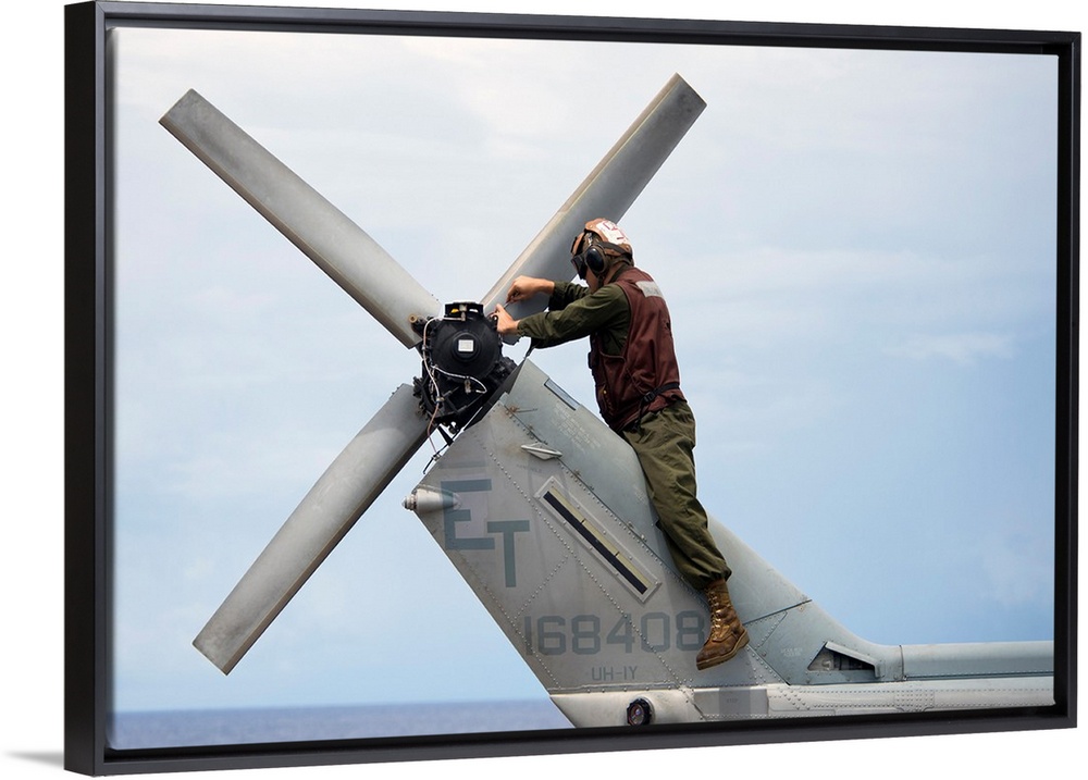 <p>A Marine conducts maintenance on the tail of an UH-1N Huey helicopter.</p>