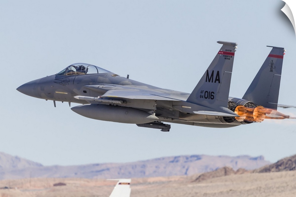 <p>A Massachusetts Air National Guard F-15C Eagle takes off from Nellis Air Force Base, Nevada, on a Red Flag mission.</p>