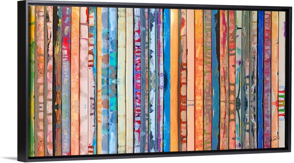 <p>Contemporary abstract painting of slatted bars with vibrant colors.</p>