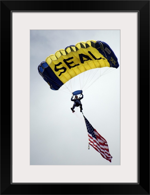 <p>A member of the U.S. Navy Parachute Team descend through the sky with the American flag.</p>