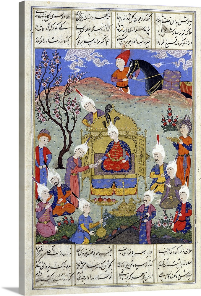 <p>Ms D-184 fol.146a A messenger brings news to Siavosh of the birth of his son, illustration from the 'Shahnama' (Book of Kings), by Abu'l-Qasim Manur Firdawsi (c.934-c.1020) c.1510-40 (gouache on paper) by Persian School, (16th century); Institute of Oriental Studies, St. Petersburg, Russia</p>