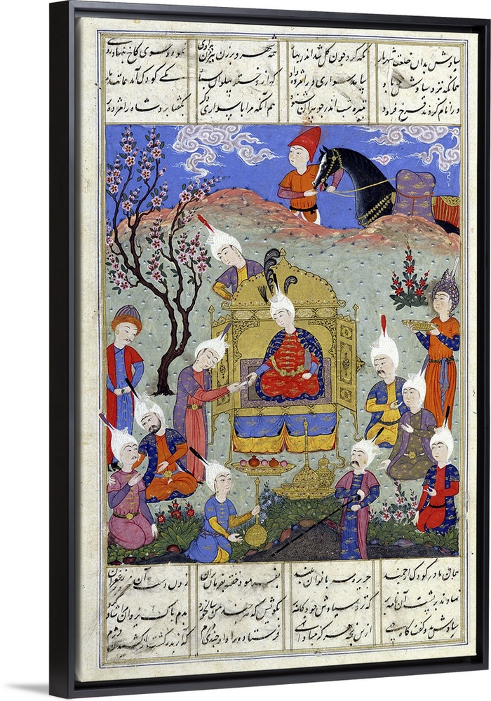 <p>Ms D-184 fol.146a A messenger brings news to Siavosh of the birth of his son, illustration from the 'Shahnama' (Book of Kings), by Abu'l-Qasim Manur Firdawsi (c.934-c.1020) c.1510-40 (gouache on paper) by Persian School, (16th century); Institute of Oriental Studies, St. Petersburg, Russia</p>