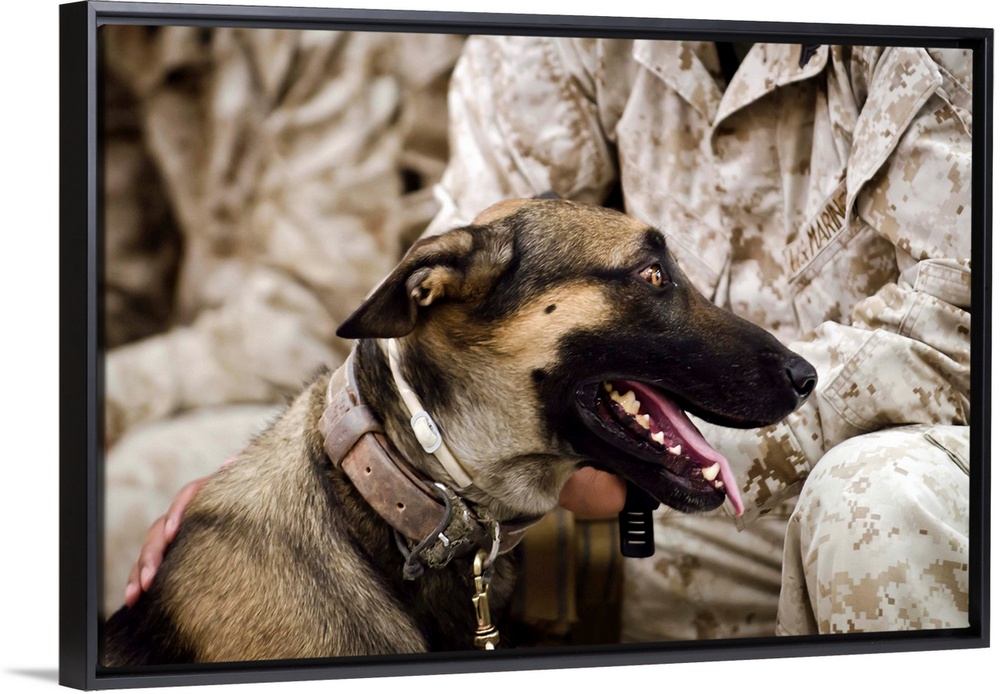 <p>A military working dog sits at the feet of his dog handler.</p>