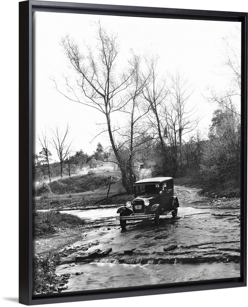 <p>A Model A Ford crossing a creek bed in Oldham County, Kentucky. Photograph, 1930.</p>