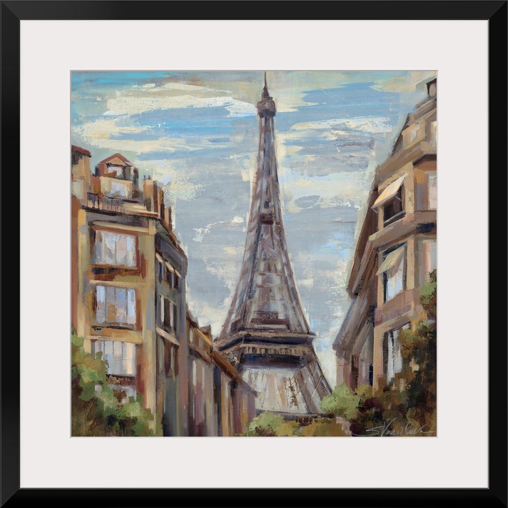 <p>Big, square, scenic painting of tall buildings in Paris, leading to the Eiffel Tower in the center.</p>