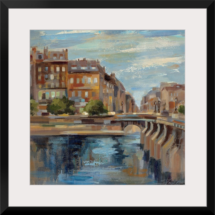 <p>This contemporary artwork is a painting of scenery in Paris with a small bridge over water and buildings straight ahead.</p>