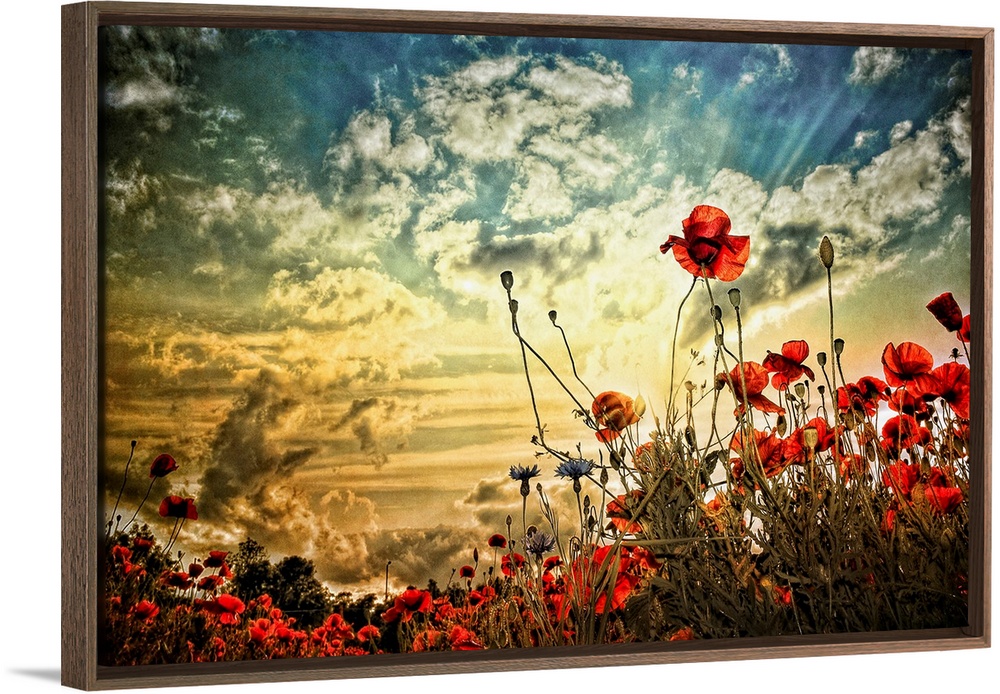 <p>Photograph of a poppy field under a cloudy sky.</p>