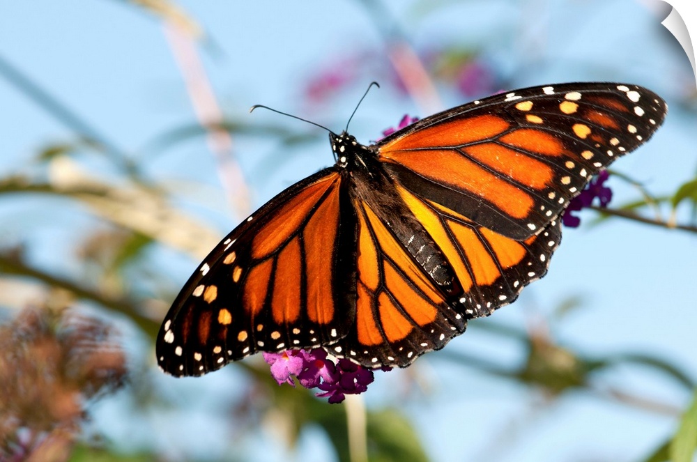 <p>A monarch butterfly, Danaus plexxipus, visiting butterfly bush flowers, Buddleia davidii.</p>