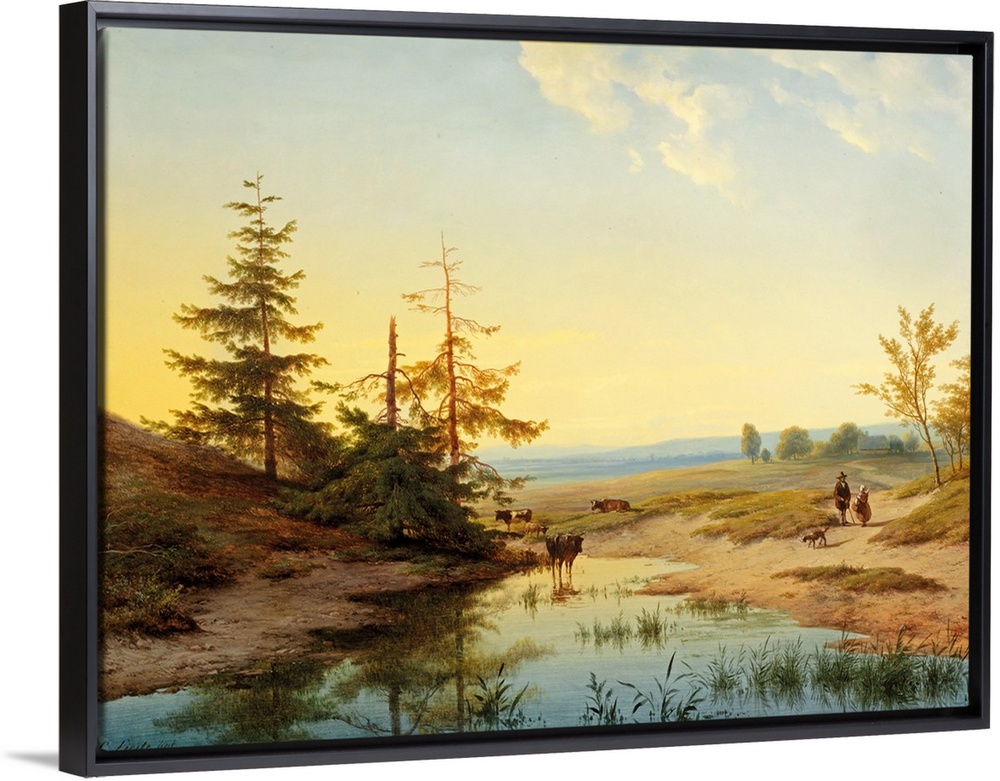 <p>A moorland with figures and cattle by a pond, oil on panel. By Cornelis Lieste (1817-1861).</p>