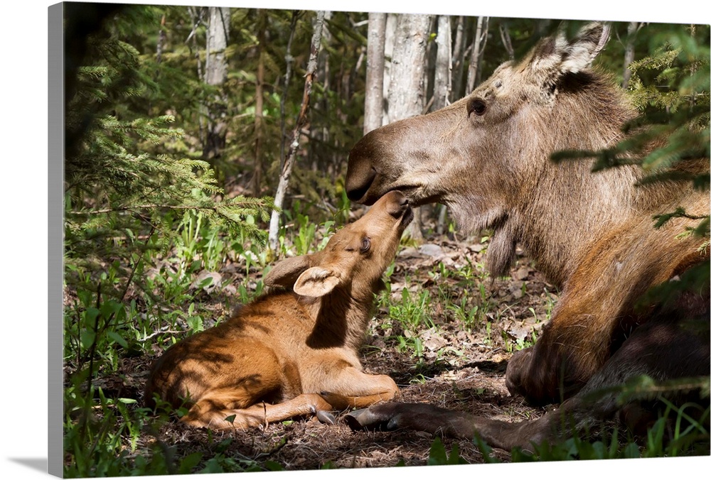 <p>A New Moose Calf Nuzzles Her Mom As They Lay In The Woods Near Cheney Lake, Anchorage, Southcentral Alaska, Spring</p>