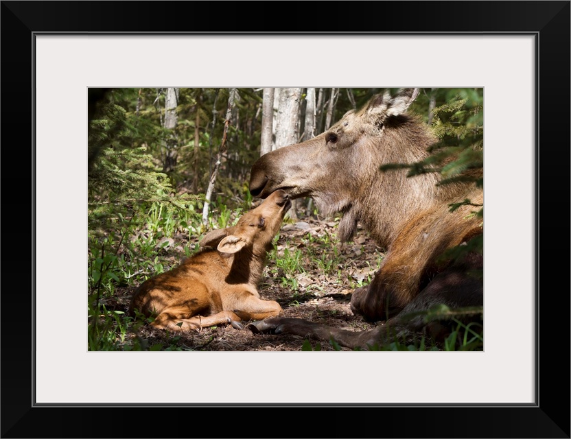 <p>A New Moose Calf Nuzzles Her Mom As They Lay In The Woods Near Cheney Lake, Anchorage, Southcentral Alaska, Spring</p>