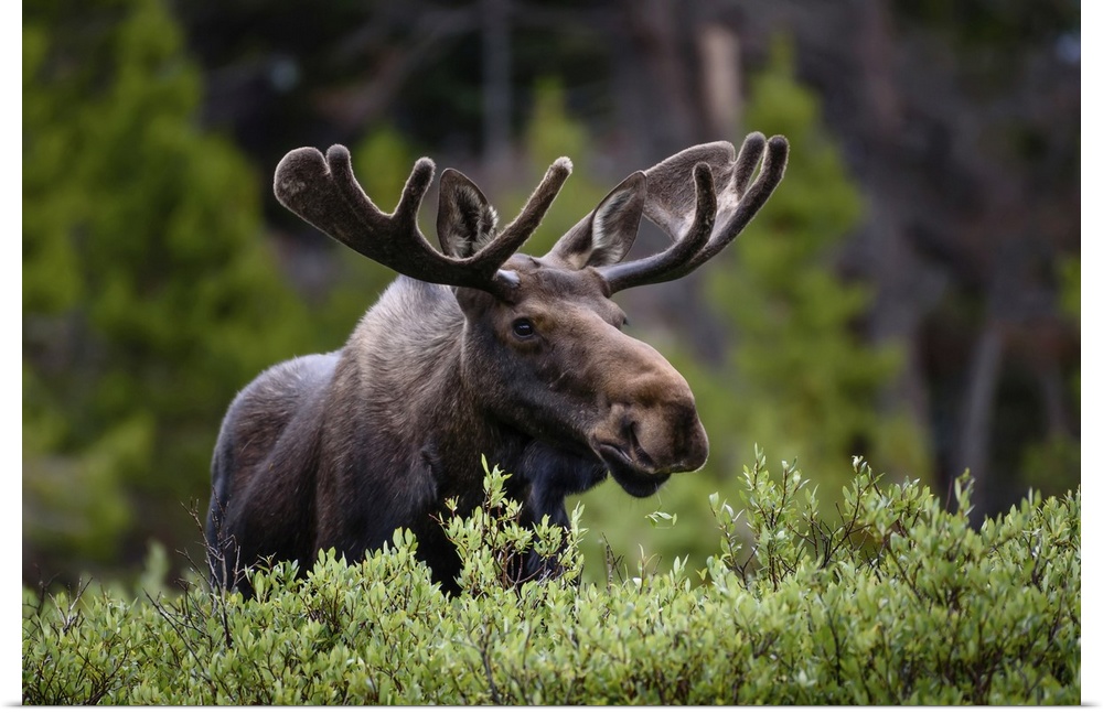 <p>A moose (Alces alces) stands by lush foliage in the Rocky Mountains; Colorado, United States of America</p>