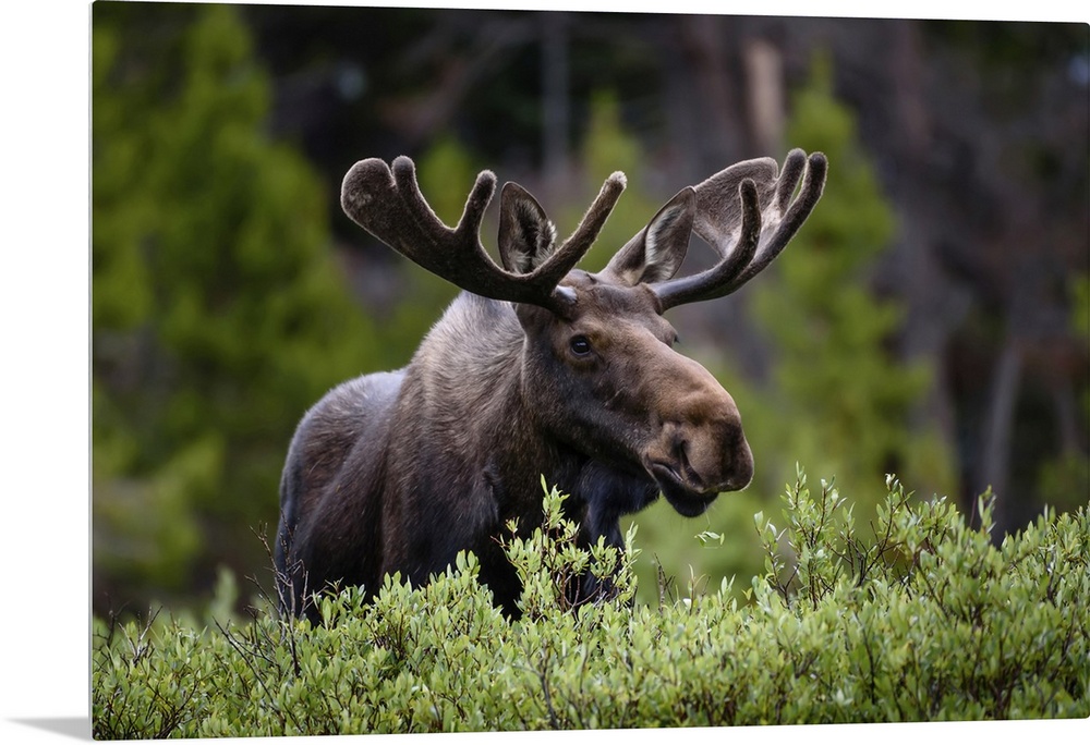 <p>A moose (Alces alces) stands by lush foliage in the Rocky Mountains; Colorado, United States of America</p>